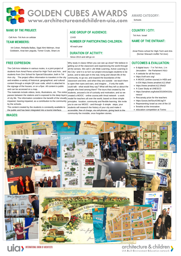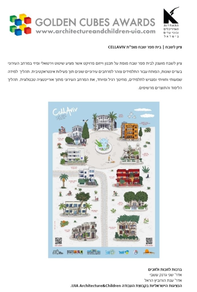 מיזם Cell Aviv – תל אביב בסלולר – מסלולי תיירות מתוקשבים בעיר תל אביב, זכה השבוע לציון לשבח מטעם התאחדות האדריכלים בישראל, בשלב הלאומי של תחרות “קוביות הזהב” הבינלאומית. פרסי ה- Golden Cubes מוענקים אחת לשלוש שנים לפעילים ולארגונים המקדמים חינוך לסביבה הבנויה, בקרב ילדים ובני נוער. הפרס מוענק מטעם ארגון האדריכלים הבינלאומי UIA. בשלב הלאומי, זכה לציון לשבח תיכון עמל להייטק ולאמנויות ע"ש פרס ( שבח מופת לשעבר) על מסלולים מרשימים בעיר תל אביב והנגשת המרחב העירוני למבקר העצמאי. מנימוקי השופטים: