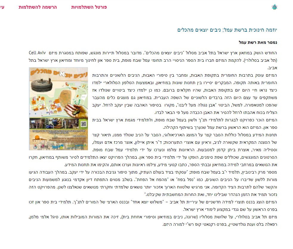 גם אתם רוצים לראות את המתרחש מאחורי הקלעים? סקרנים לשמוע את חנה רובינא האגדית ב"הדיבוק" ? מעוניינים ללמוד על גלגוליו של התיאטרון הלאומי? סרקו את הקוד ! מיזם Cell Aviv Habima (תל אביב בסלולר) לציון 100 שנים לתיאטרון הבימה, פותח על ידי תלמידי הרב תחומי עמל שבח מופת תל אביב בשיתוף תלמידי בית ספר און לחינוך מיוחד ונכויות מורכבות. הצורך? הצפת ההיסטוריה התרבותית הסמויה של הבימה, התיאטרון הלאומי, החל מהקמתו ברוסיה ועד הפיכתו למוקד תרבותי בישראל. באמצעות סריקת QR קוד לטלפון שלכם, תוכלו להיחשף למידע עשיר הכולל מלל, תמונות, סרטוני ארכיון סרטוני מקור ואפילו משחק חידות מגניב! חלק מהסרטונים מונגש במטרה לסייע ללקויי ראייה, לקויי שמיעה ולאנשים עם מוגבלויות. ….בחרו שעה! פרויקט רב תחומי – ספרות (ענת טפר) – היסטוריה ותקשוב (רפאלה בלס). בית ספר און: ענת גולדשטיין
